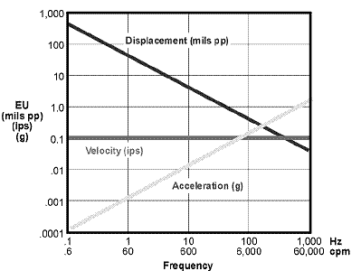 저주파는 일반적으로 속도 (in/s) 또는 변위 (mils pp)로 표현합니다. 가속도 측정값은 적분 회로를 이용하거나 소프트웨어를 사용하여 변환합니다. 진동은 속도센서나 비접촉식 변위센서를 이용하여 측정할 수 있습니다. 그러나 이런 센서들은 압전형 가속도 센서에 비해 다양성이 부족합니다.