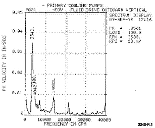 그림 3에 펌프에서 측정된 값의 예가 있습니다. 가속도 센서의 출력이 가속도, 속도 및 변위로 표시되었습니다. 변위 데이터는 저주파에서 가장 큰 진동이 관측되었으나 10,000cpm (167Hz) 이상에서는 감도가 낮아졌습니다. 가속도로 표현된 데이터는 매우 넓은 주파수 범위의 데이터를 제공합니다.