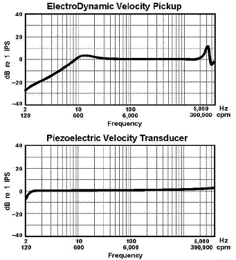 압전형 속도센서(PiezoVelocity Transducer, PVT)는 적분기가 내장된 저주파용 가속도계입니다. 압전형 속도센서는 전자기식 속도 센서와 비교해 볼 때 더 넓은 주파수 범위를 가집니다. (그림 6 참조) 그러나, 압전형 속도센서도 주파수 및 진폭상으로 극저주파용 가속도 센서만큼 낮은 주파수를 측정할 수는 없습니다. 그 이유는, 낮은 주파수의 적분에는 내장된 앰프에 더 높은 증폭 계수가 요구되기 때문입니다. PVT 센서는 통상 1.5Hz (90cpm) 이하의 주파수를 제거하도록 필터를 사용합니다.