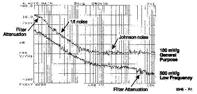 모든 앰프들은 저항, 다이오드 및 트렌지스터와 같은 다양한 전기적인 노이즈 요인을 내포하고 있습니다. 저항들은 존슨 (Johnson, White) 노이즈를 생성합니다. 이 것은 불충실한 스테레오 시스템에서 잘 알려진 “툭툭 하는 소리 (Crackle)”로 잘 알려져 있습니다. 트랜지스터 및 다른 소자들은 쇼트키 (Schottky, 1/f) 노이즈를 생성합니다. 쇼트키 노이즈는 주파수가 감소하면 증가하며, 그림 10에서 표시한 것과 같이 최저 주파수 측정 범위를 결정합니다. 가속도계에서 저주파수 노이즈는 회로의 증폭 계수에 비례하며, 압전 소자의 전하 감도와 반비례합니다.