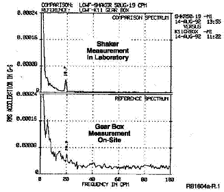 그림 13에 나타난 스펙트럼은 저주파 측정에서 환경적인 노이즈 영향을 나타냅니다. 500mV/g 가속도계와 차동 입력 데이터 수집장치를 사용하여 비누 공장의 교반기 감속기에서 측정된 진동 데이터입니다. 감속기 진동은 실험실에서 저주파 가진기로 모의 실험되었습니다. 축 진동 출력은 19cpm (0.32Hz)에서 2.4mils로 측정되었습니다. 변위값으로의 적분은 측정 후 소프트웨어를 이용하여 수행되었습니다. 실험실과 공장에서 수집한 스펙트럼을 비교해 보면 공장의 환경에 의한 노이즈 증가가 명확히 나타납니다. 이 적용에서 측정장비 및 센서의 시스템 노이즈는 측정 요소가 아닙니다.