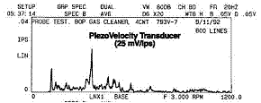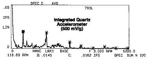 그림 15c의 스펙트럼은 500mV/g 출력의 수정 가속도계를 이용하여 측정된 데이터입니다. 매우 큰 Ski Slope가 센서의 앰프 노이즈에 의해 발생되었습니다.